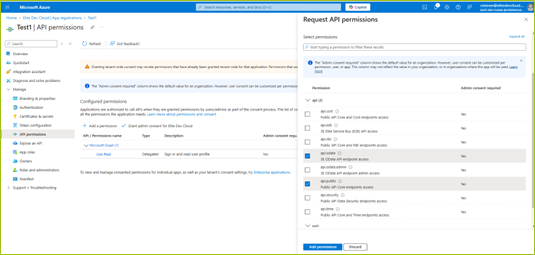 Click Add permissions to add the APIs under delegated permissions to your application.